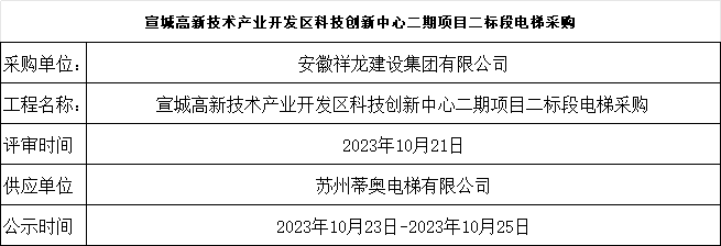 宣城高新技術(shù)產(chǎn)業(yè)開發(fā)區(qū)科技創(chuàng)新中心二期項(xiàng)目二標(biāo)段電梯采購(gòu)結(jié)果公示